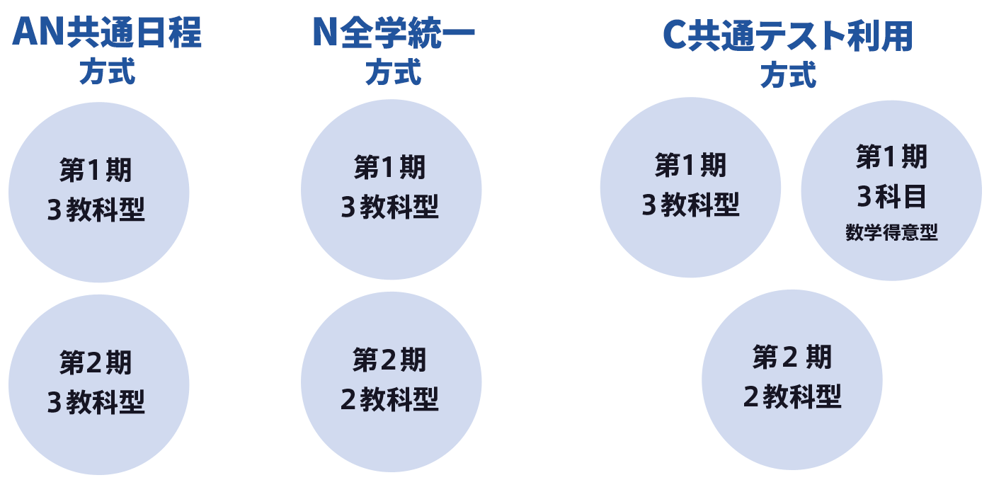 | AN共通日程⽅式 | 参加学部共通問題 受験機会は <第1期>2月3日,4日,5日<第2期>2月20日の4回 3教科で受験可能 |