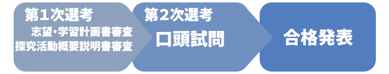 第1次は「志望・学習計画書等」「探究活動概要説明書審査」、第2次は「口頭試問」にて選考します。