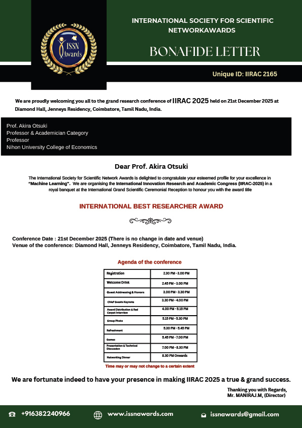なお、授賞式は、2025年12月21日(日)に、Diamond Hall, Jenneys Residency, Coimbatore, Tamil Nadu, India. で開催される、International Innovation Research and Academic Congress (IIRAC-2025) にて催される予定です。