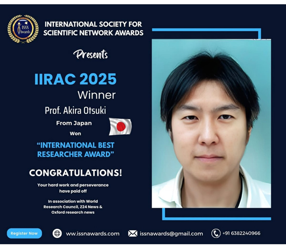 大槻明教授が、International Society for Scientific Network (ISSN) から INTERNATIONAL BEST RESEARCHER AWARD 2025(Field of Machine Learning)を受賞しました。